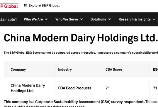 现代牧业标普全球评分迈向新高 位列中国乳业第一